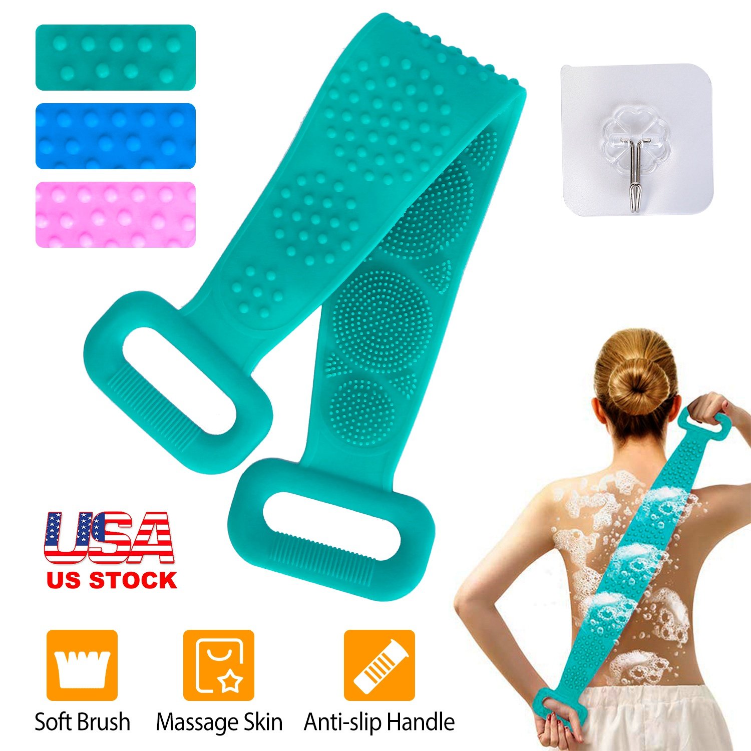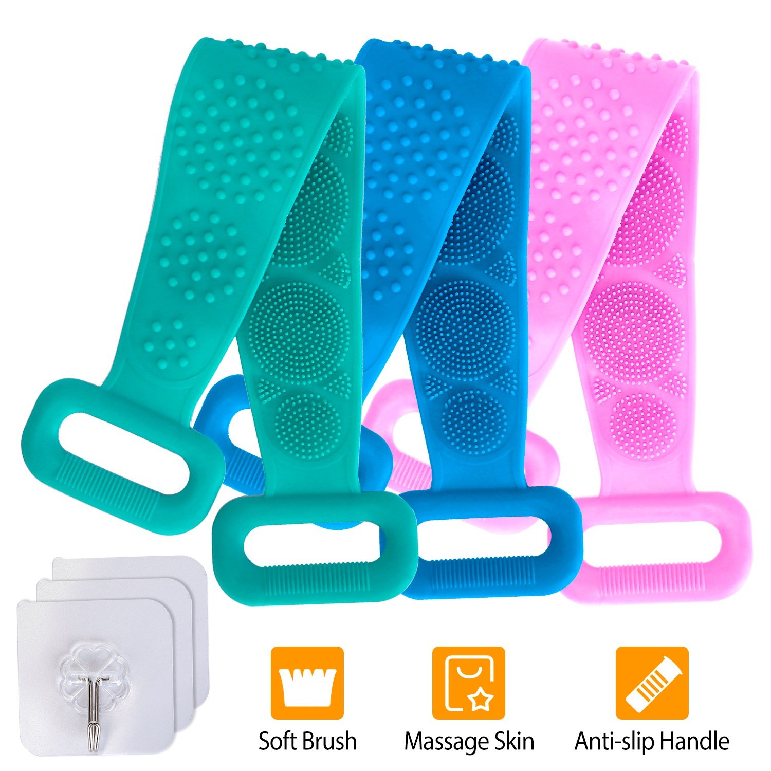 Silicone Back Scrubber Belt For Shower Exfoliating Foaming Body Wash Strap Brush Bristles Massage Dots W/ Adhesive Hook